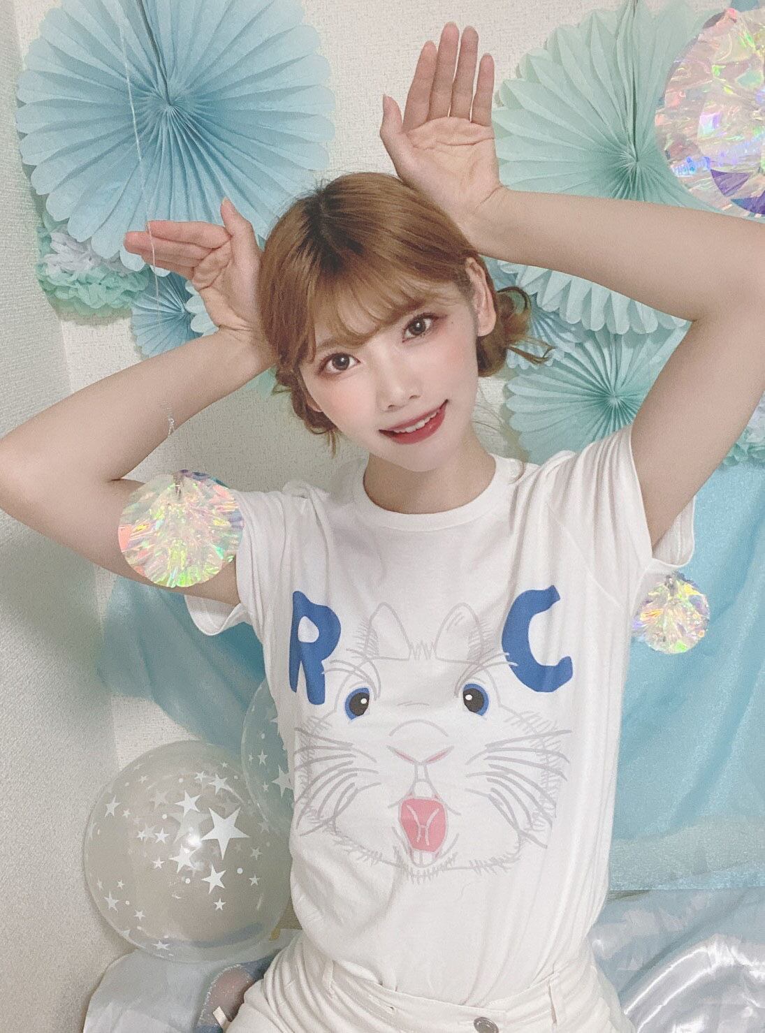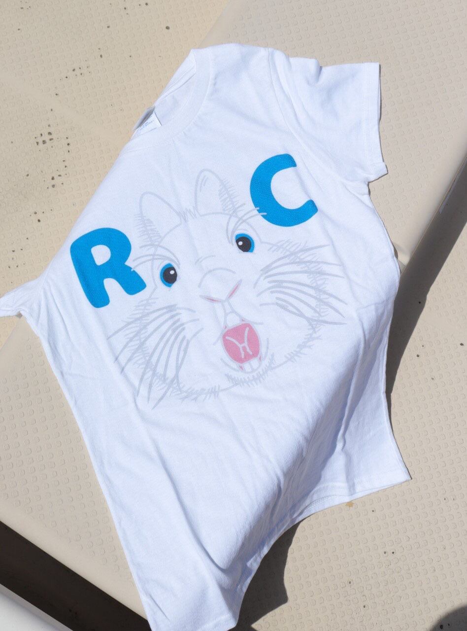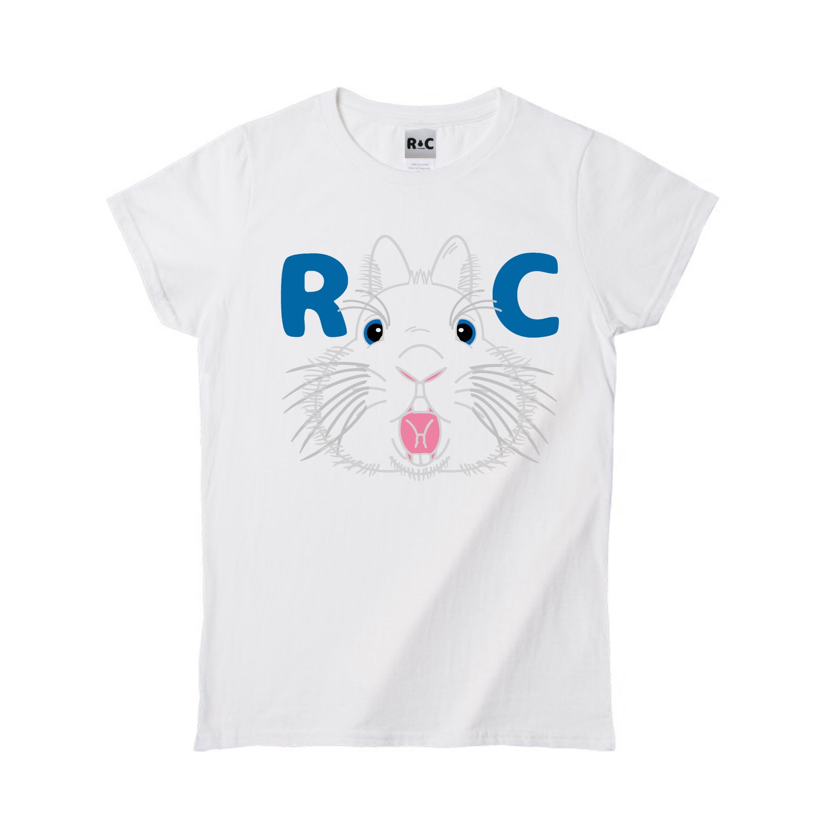 Rabbit Castle 〜うさぎのお城〜のお店のロゴのうさぎマークが前に飛び出してきたイメージをフロントにプリントしたオリジナルレディースTシャツです。