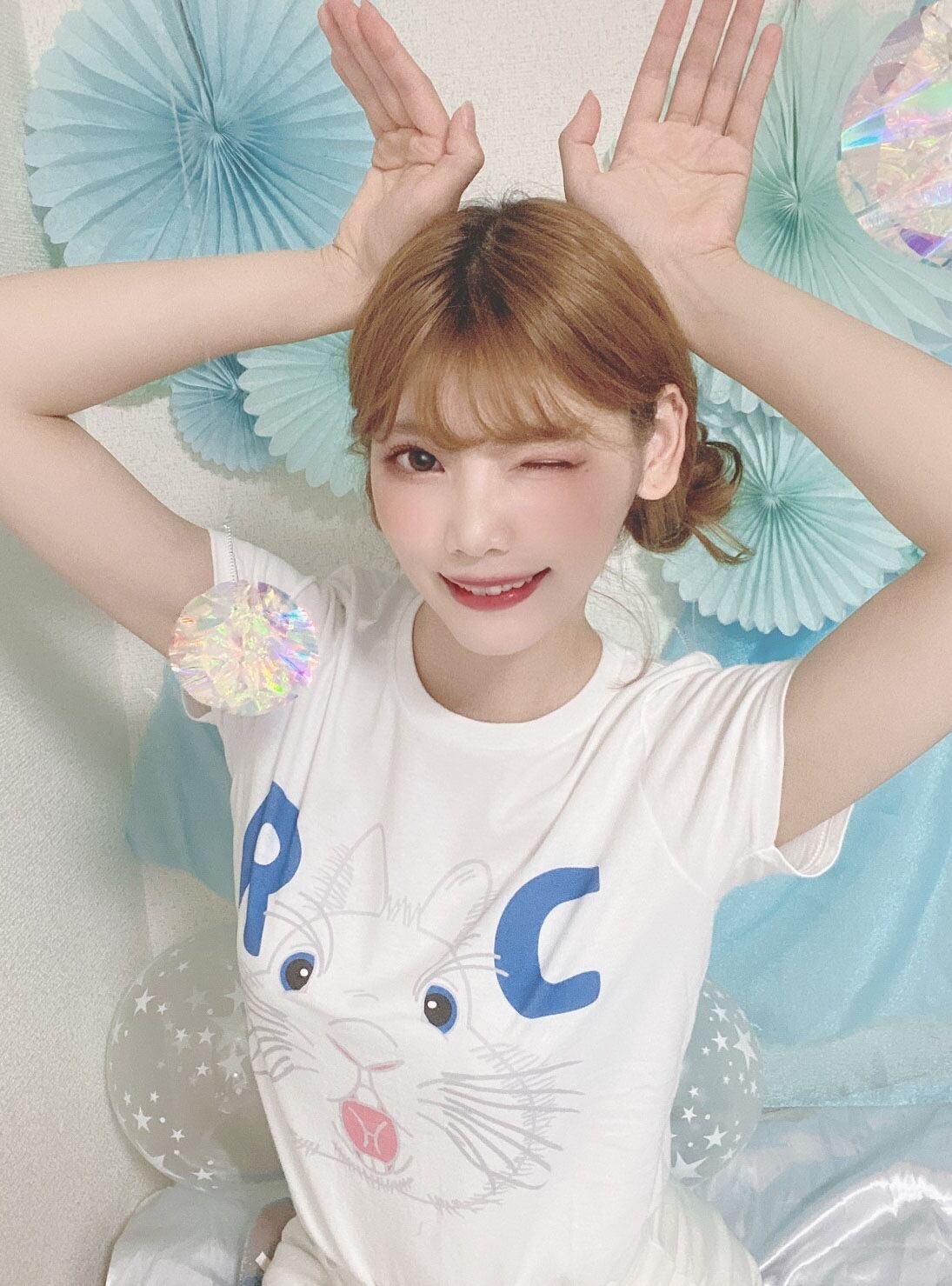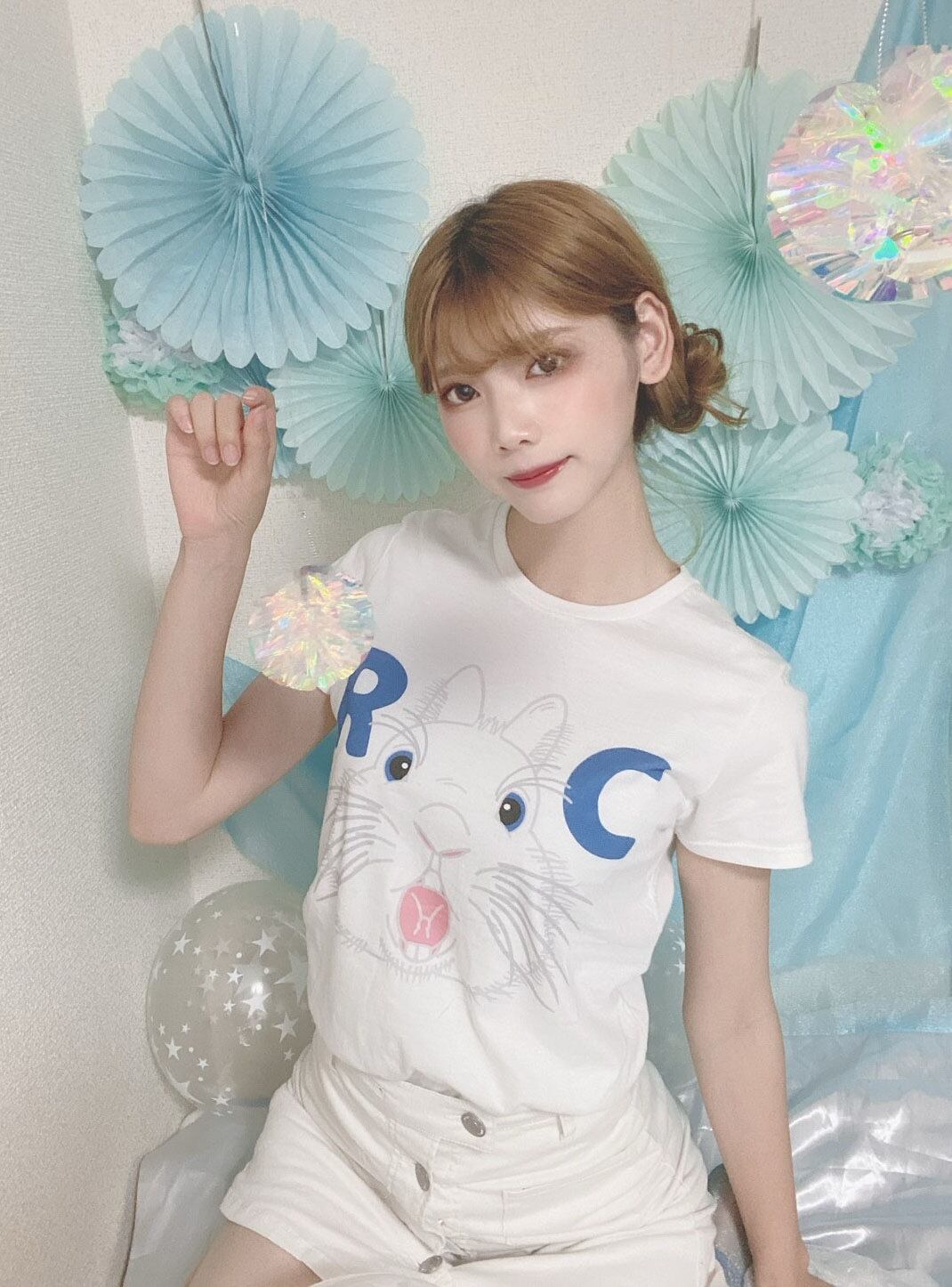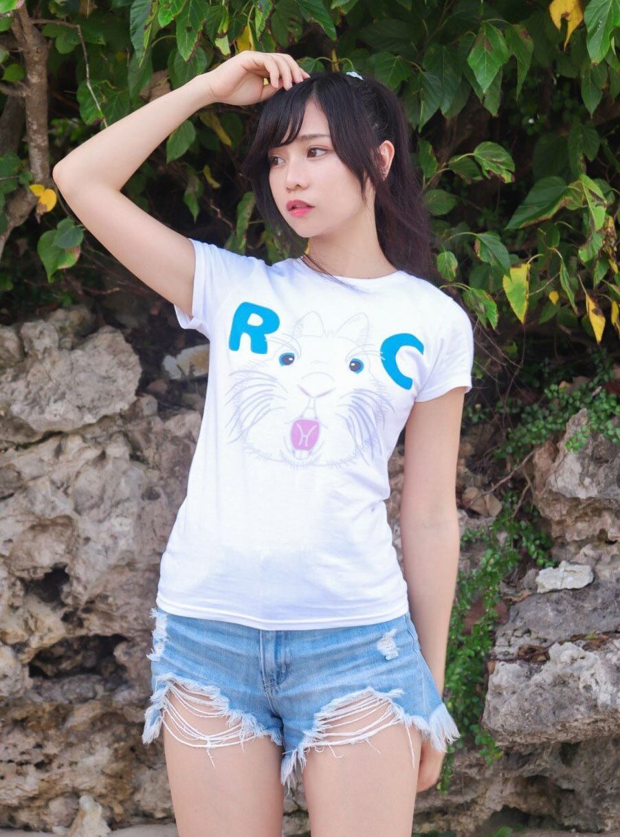 Rabbit Castle 〜うさぎのお城〜のお店のロゴのうさぎマークが前に飛び出してきたイメージをフロントにプリントしたオリジナルレディースTシャツです。